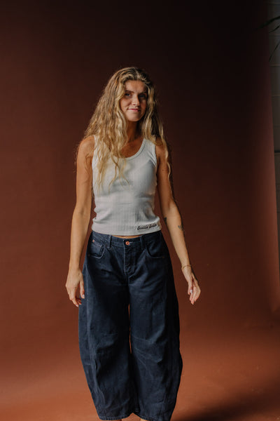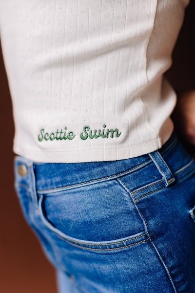 White Pointelle Tank Top with Scottie Swim classic logo in green embroidery